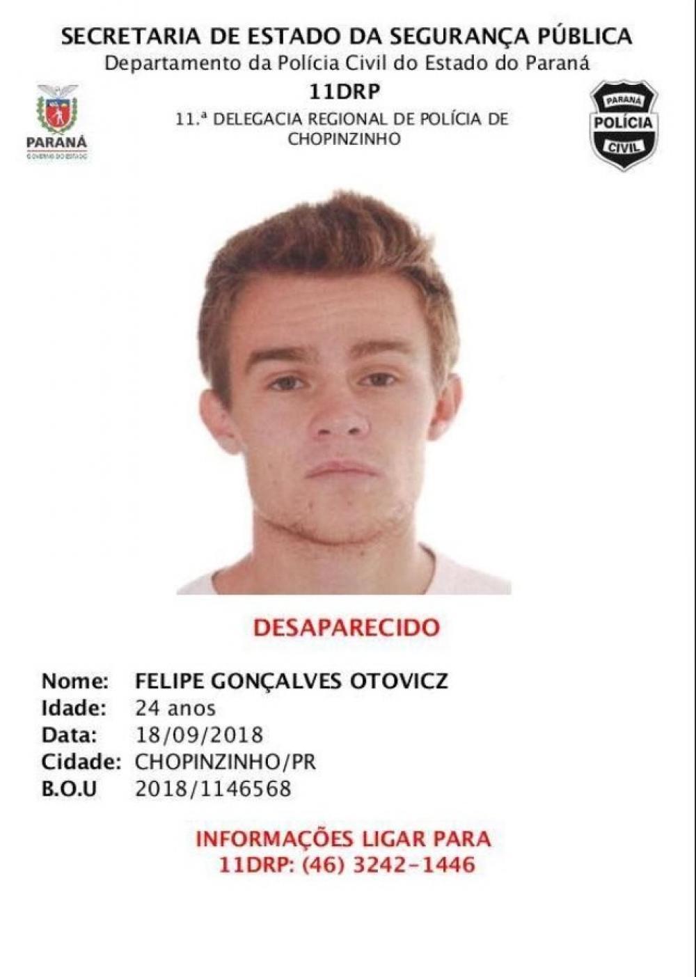 Está desaparecido em Chopinzinho desde o último dia 18 de setembro, o jovem Felipe Gonçalves Otovicz, de 24 anos de idade. Familiares procuraram a Polícia, onde registraram boletim de ocorrência do desaparecimento.