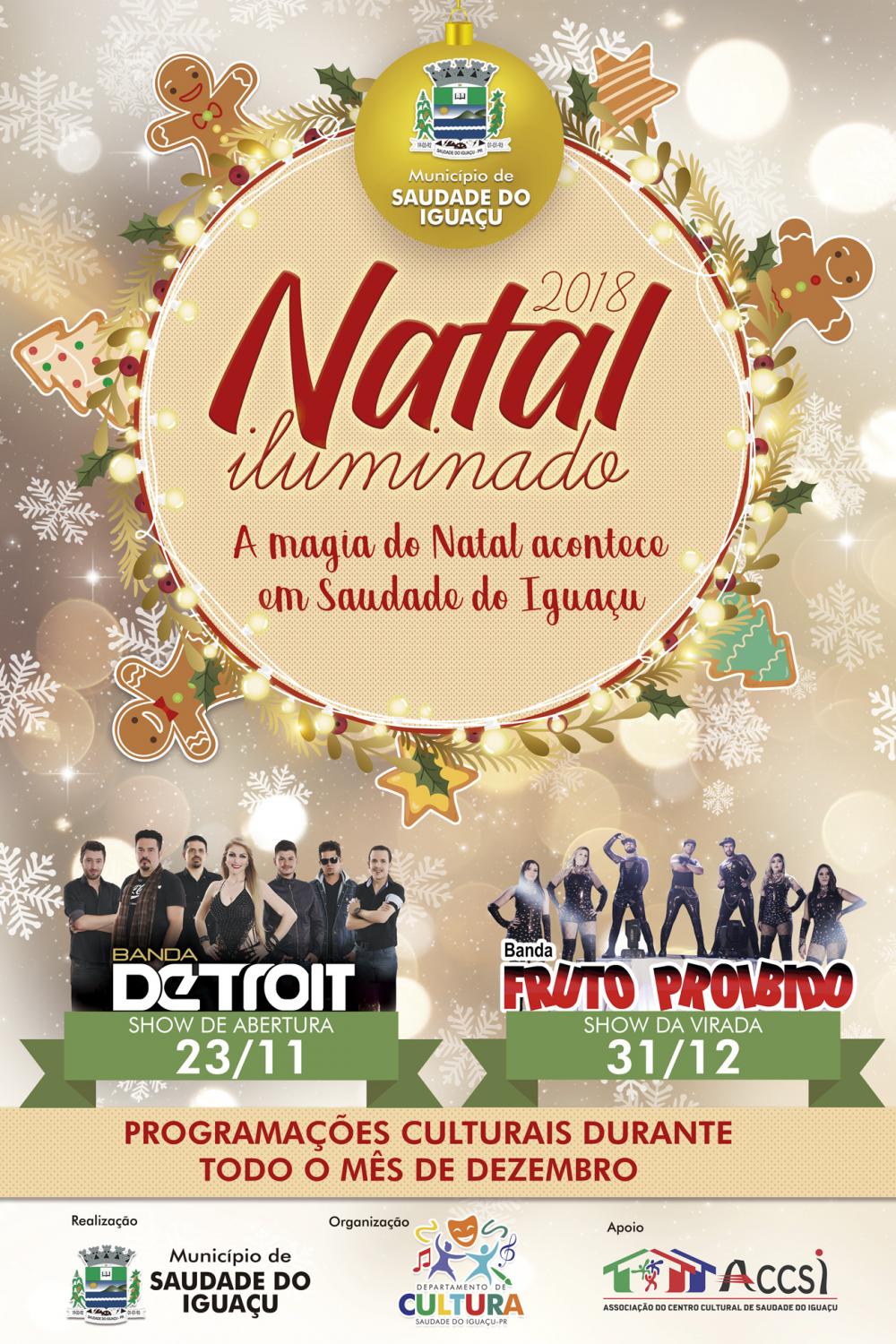 Para Willian Cemin, Diretor de Cultura e coordenador do “Natal Iluminado”, a programação atenderá a todos os públicos. “Procuramos preparar uma programação que atendesse a todos os públicos. Neste ano, conseguimos reunir eventos que farão a alegria desde a criança até o vovô e vovó, criando uma atmosfera de alegria, interação e muita diversão. Nosso Natal é uma festa para todos, a alegria precisa estar presente durante todos os dias desta época mágica, por isso todos os nossos eventos são totalmente gratuitos. Nesta época, Saudade do Iguaçu se veste com o brilho das luzes e o município sorri, este é nosso principal objetivo, além de manter viva a cultura do Natal renovando a cada ano a alegria de se comemorar o nascimento de Jesus”. Disse Willian Cemin.