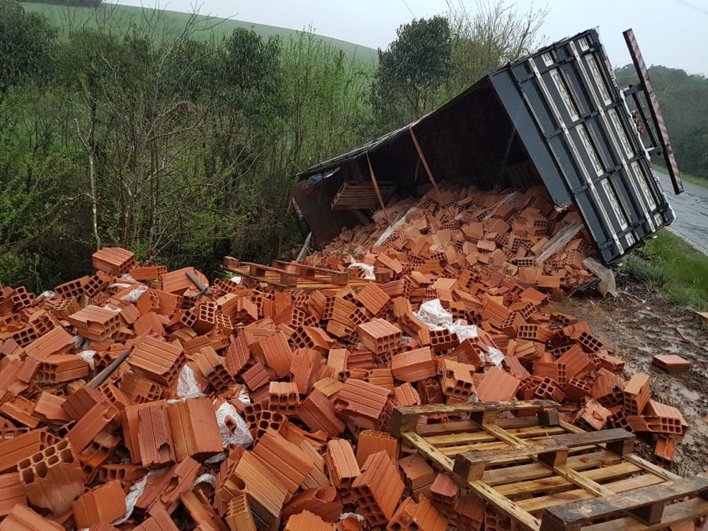 Na manhã desta quinta-feira, dia 20, por volta das 07:30, um caminhão carregado com tijolos tombou na rodovia PR 281 entre Chopinzinho e São João, na altura da comunidade do Lagoão.