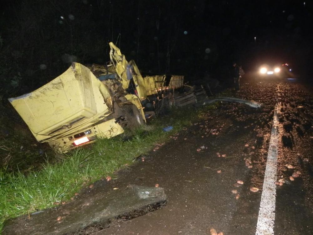 Um veículo caminhão placas de Guarapuava se deslocava sentido ao Candói, quando no final da descida após a reserva indígena em um curva, o motorista perdeu o controle da direção e tombou o veículo ao lado da rodovia. O motorista teve ferimentos graves, principalmente em uma das mãos, o qual ficou preso às ferragens e foi retirado por populares e pela equipe da Defesa Civil. Também havia um caroneiro no caminhão o qual teve ferimentos leves. Ambos foram encaminhados pela ambulância da secretaria municipal de saúde do Candói para o hospital. O caminhão estava transportando uma carga de batatinha, a qual ficou toda esparramada pela rodovia e no acostamento.