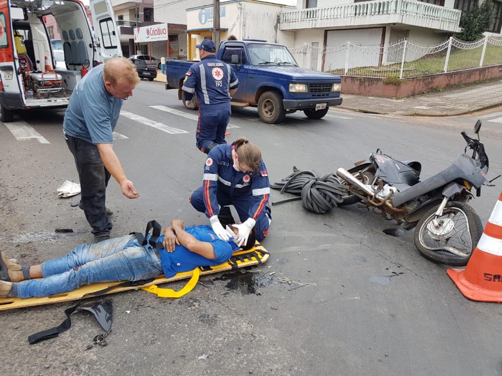 Do acidente resultou em danos de grande monta na moto e ferimentos na perna esquerda do comdutor Lindolfo Niendicker, o qual foi encaminhado pela equipe do SAMU ao hospital para receber atendimento médico.
