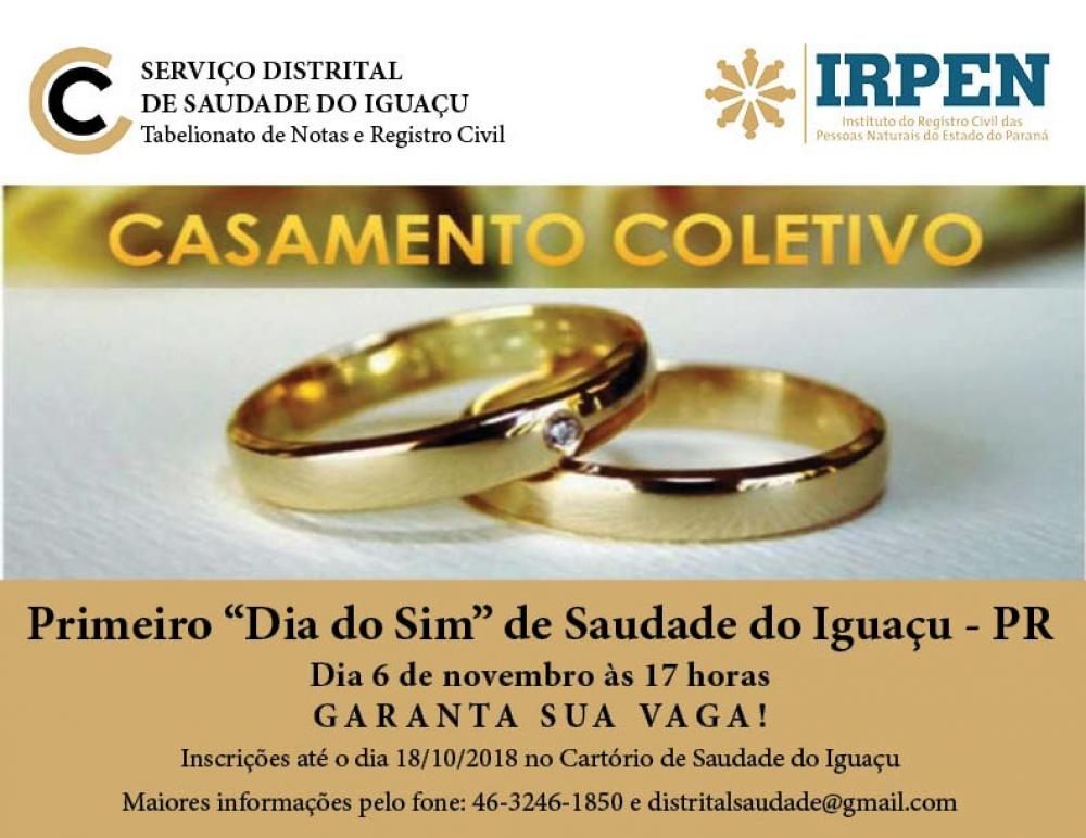 Estão abertas em Saudade do Iguaçu as inscrições para casais interessados em regularizar a união através de um casamento coletivo. De acordo com a Oficial Interventora do Cartório de Saudade do Iguaçu, Dra Elisana Carneiro Crema, os interessados devem procurar o cartório que fica localizado na Rua Padre Felipe Siera, 964, em frente à Igreja Matriz de Saudade do Iguaçu até o dia 18 de outubro.