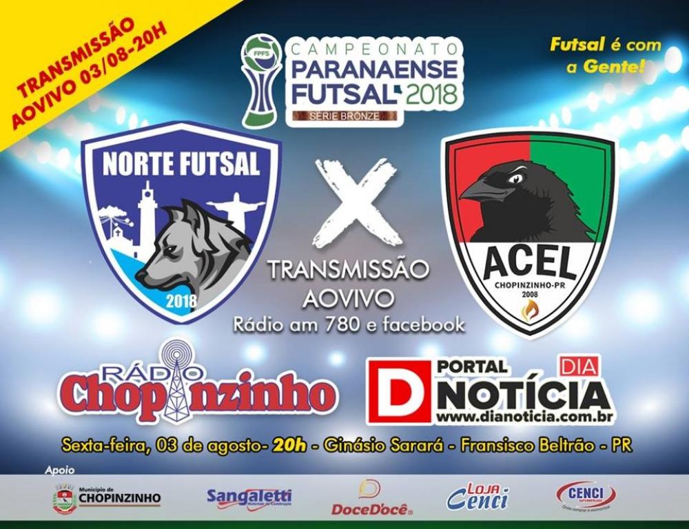 A equipe da ACEL-Chopinzinho volta à quadra na noite na última rodada da primeira fase do Campeonato Paranaense de Futsal, série bronze. Já garantida na próxima fase e com o segundo lugar do grupo, a equipe do técnico Tonhão, vai à Francisco Beltrão para enfrentar a equipe do Norte/Futsal, que precisa da vitória.