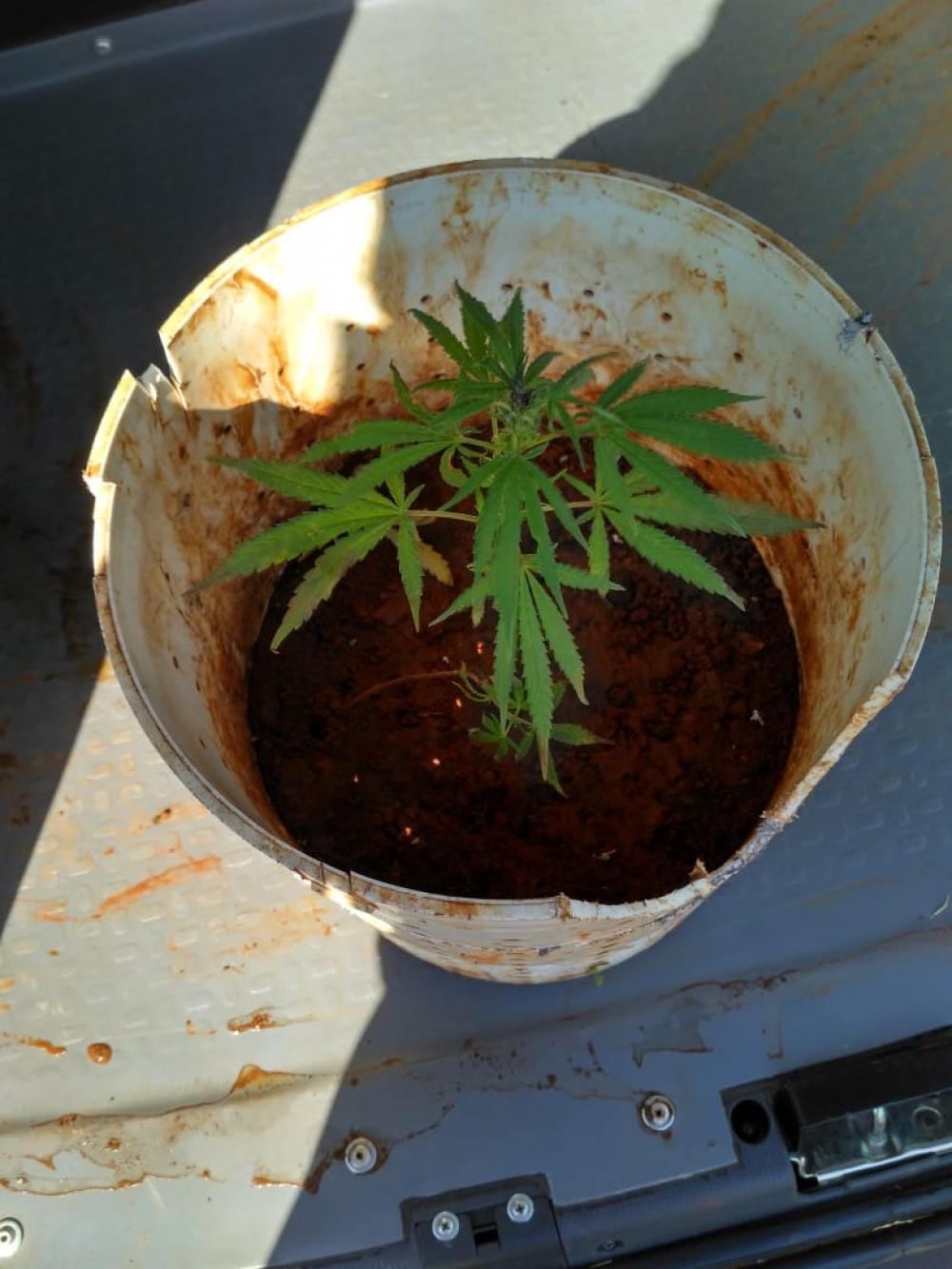 Sendo assim, a equipe foi até a referida comunidade, onde na residência de um dos adolescentes os policiais foram recebidos por uma jovem de 16 anos, a qual relatou que seu irmão estaria trabalhando no terreno da residência. Foi realizada a busca e conforme a denúncia, a planta estaria próximo a uns pés de banana. A equipe policial localizou um balde com uma planta de maconha em um coberto, ao lado da residência.