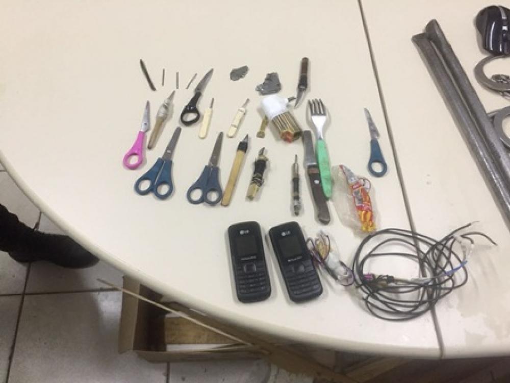 Durante as buscas foram apreendidos dois aparelhos celulares. Um no pátio e outro dentro de uma bola, além de objetos irregulares.