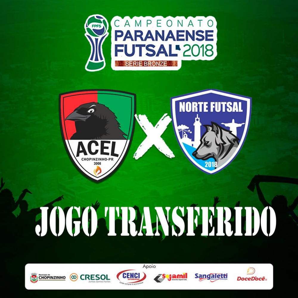 O jogo da equipe da ACEL-Chopinzinho que estava programado para este sábado, dia 26, contra a equipe do Norte Futsal de Francisco Beltrão pela série Bronze do Paranaense de Futsal, foi cancelado.