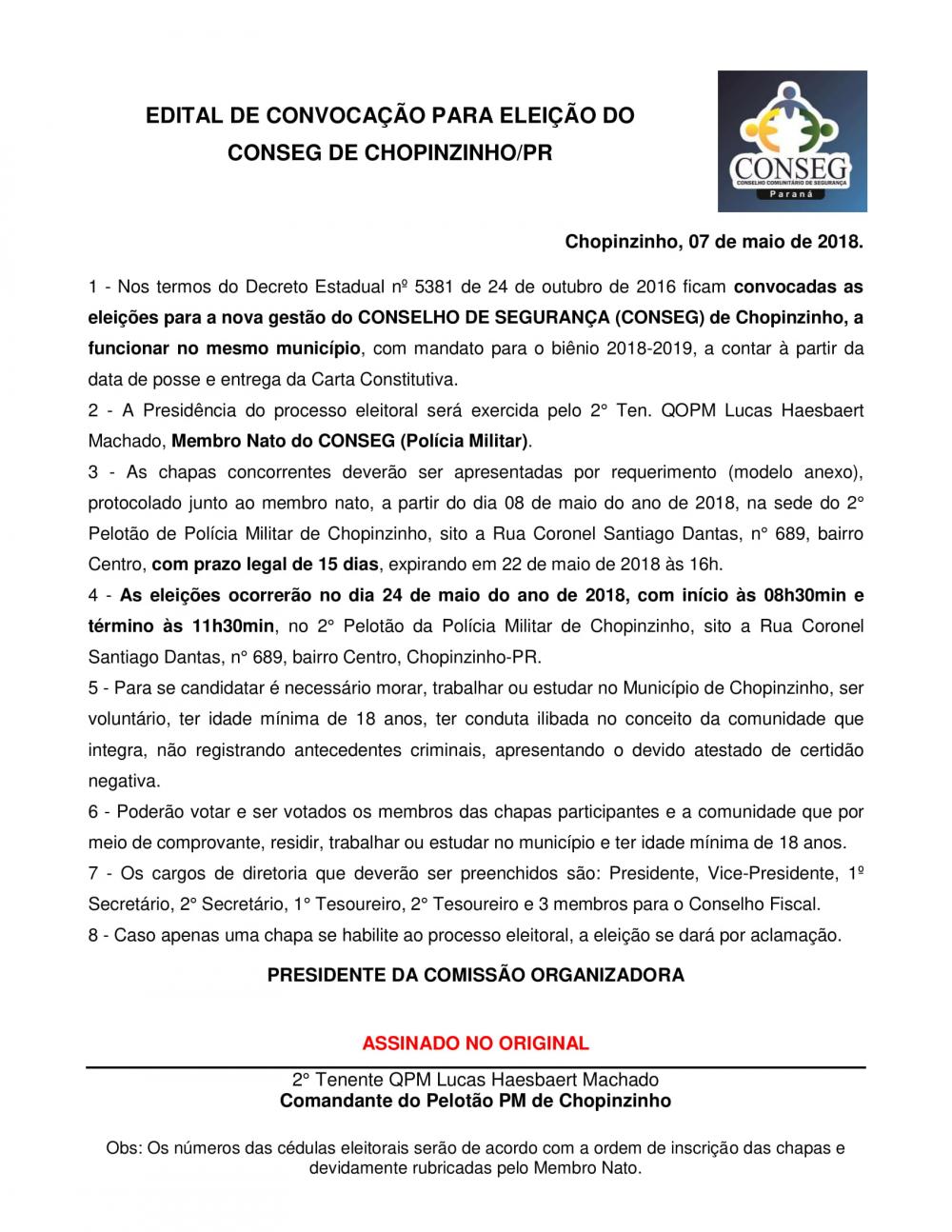 As chapas concorrentes deverão ser apresentadas por requerimento protocolado junto ao membro nato, a partir do dia 08 de maio de 2018, na sede do 2º Pelotão da Polícia Militar de Chopinzinho, sito a Rua Coronel Santiago Dantas, nº 689, centro, com prazo legal de 15 dias, expirando em 22 de maio de 2018, às 16 horas.