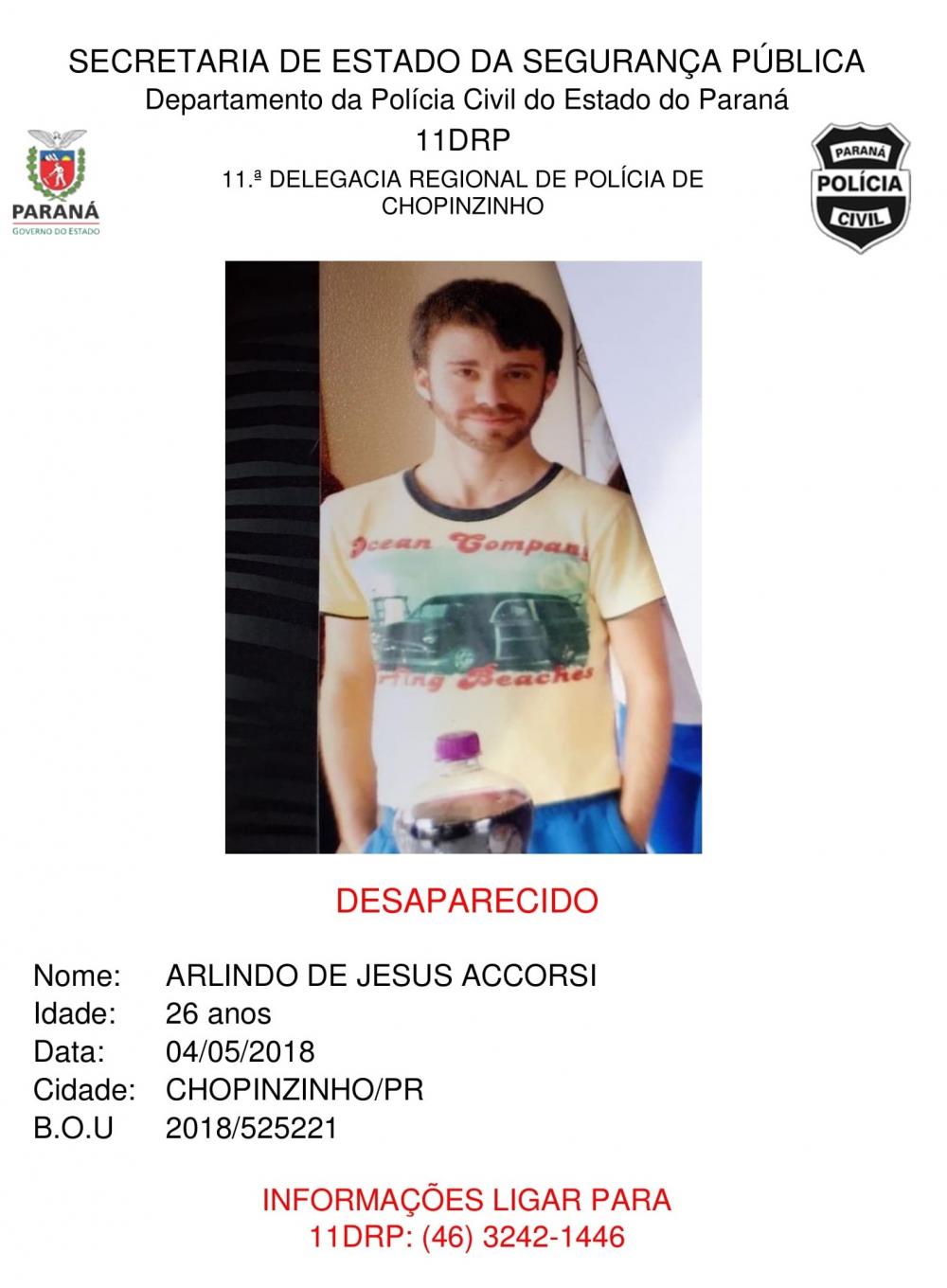 Familiares de Arlindo de Jesus Accorsi, 26 anos, procuraram a Delegacia de Polícia de Chopinzinho para registrar o desaparecimento do mesmo, o qual saiu de casa na sexta-feira, dia 04, e deixou um bilhete dizendo que iria ao mercado e posteriormente na aula, porém, não retornou mais.