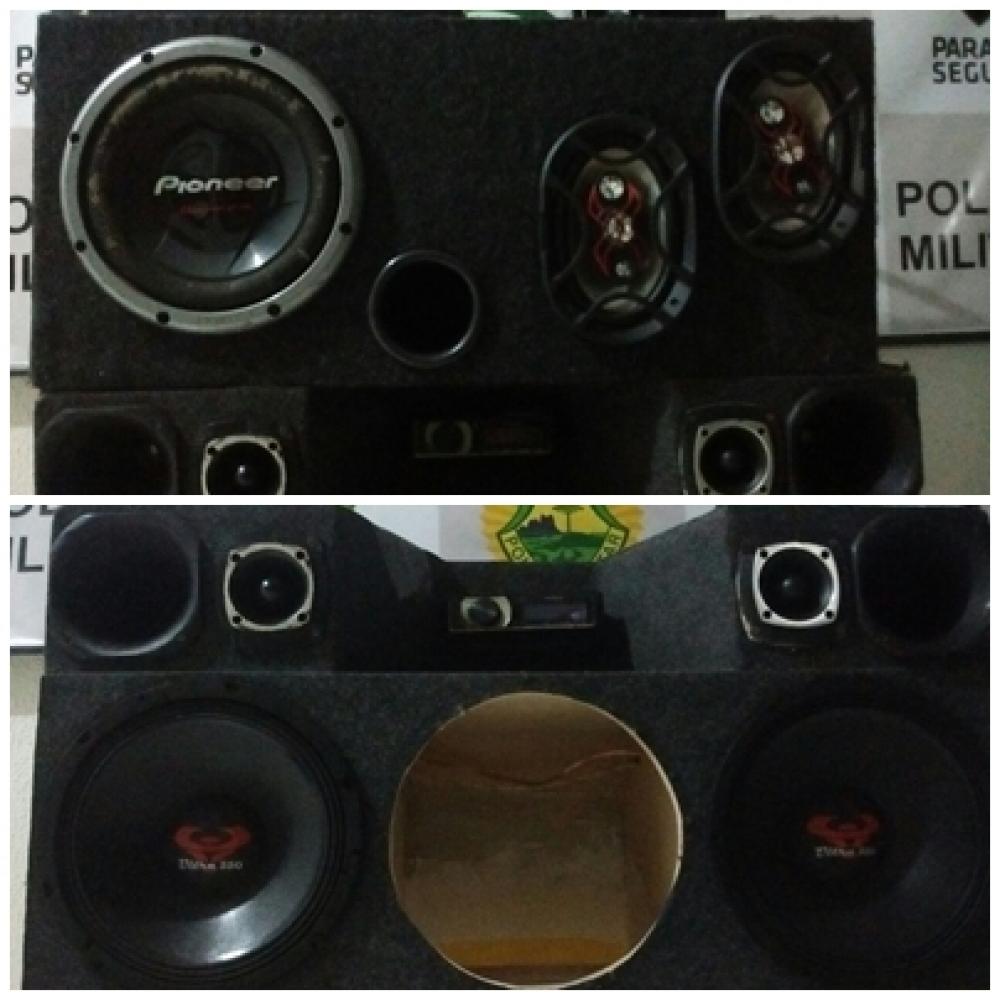 Chegando ao local foi constatado pela equipe policial que o veículo Fiat/Marea, estava com o porta malas aberto, com o som em volume muito alto. O proprietário do veículo acompanhou a equipe policial até o Pelotão da Polícia Militar para a retirada dos aparelhos, sendo dois Sub, duas cornetas, dois Twiter, um aparelho Pioneer e uma caixa de som.