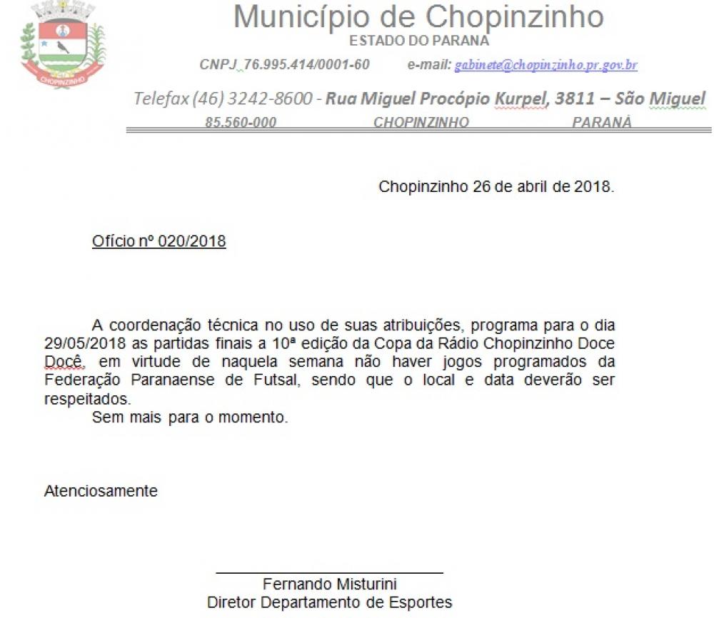 Após a definição dos finalistas da 10ª Copa Rádio Chopinzinho/Doce Docê de Futsal, a coordenação da competição, optou por definir a data das finais no dia 29 de maio.