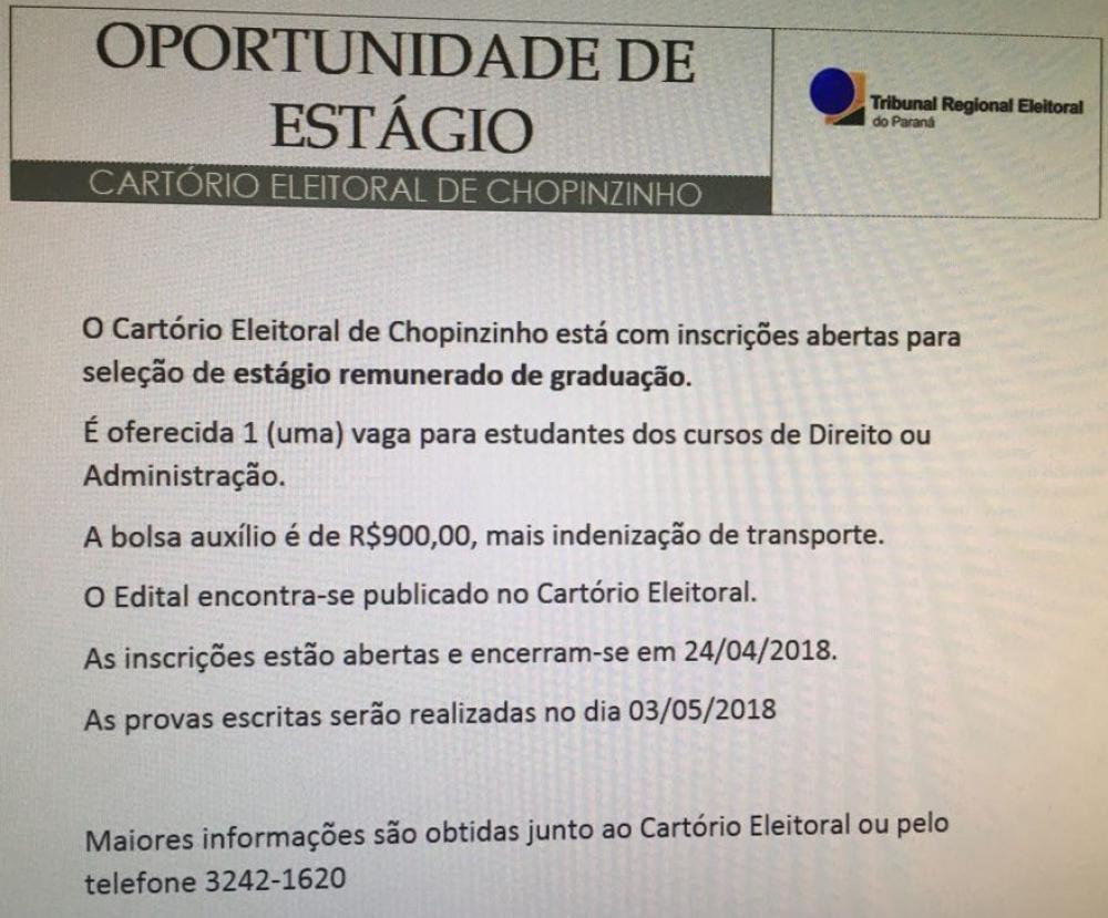 O Fórum Eleitoral da Comarca de Chopinzinho está com inscrições abertas para o preenchimento de uma vaga para estagiário remunerado para trabalhar no Cartório Eleitoral.