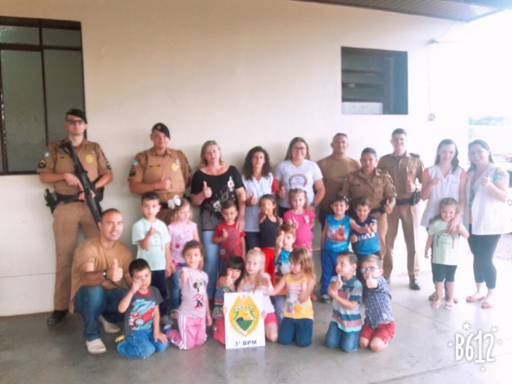 Ao todo, 17 alunos dos jardins 1A do CMEI Excelência, juntamente com Pedagoga Fabiane e as Professoras Raquieli, Rosane, Francelaise, Ester e Thailini, tomaram café da manhã reforçado, tiveram palestras sobre fardamento, atividade policial, armamento utilizado, e sobre as viaturas. Conheceram também as dependências do Pelotão bem como a central de monitoramento e o COPOM.
