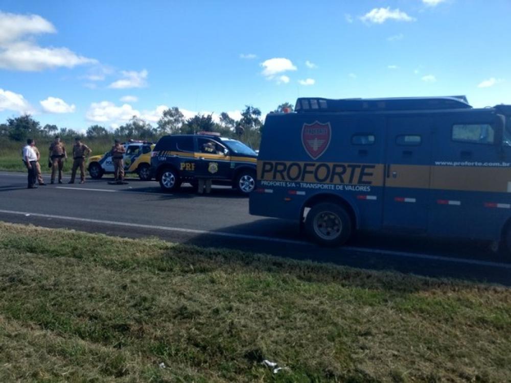 Pelo menos duas pessoas morreram e outras quatro ficaram feridas em uma tentativa de assalto a cinco carros-fortes da Proforte na BR-376, na Ponte do Rio Tibagi, próximo à Colônia Witmarsum, em Palmeira, nos Campos Gerais do Paraná. As informações são da Polícia Rodoviária Federal (PRF).
