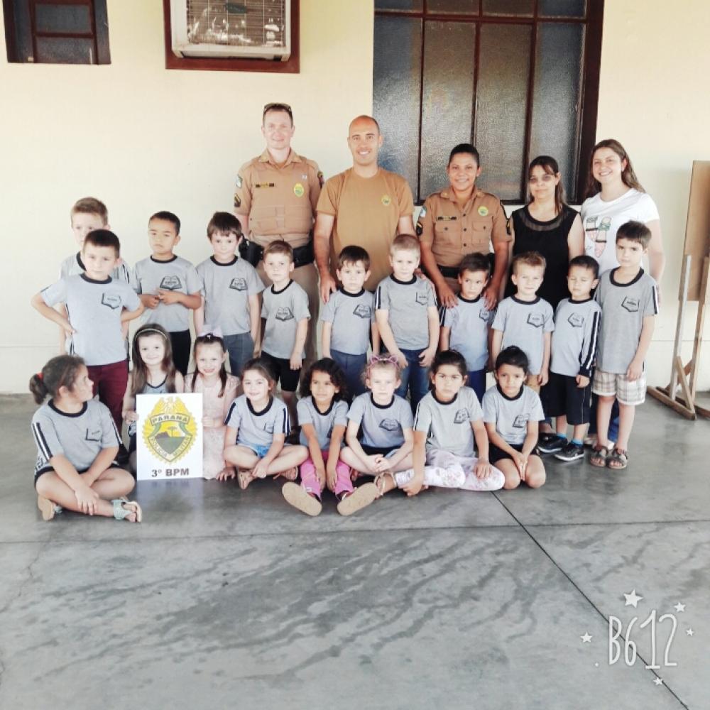 Ao todo 21 alunos dos jardins I e II da Escola Rural Municipal Presidente Costa e Silva, juntamente com a Pedagoga Kelli Casagrande e a Professora Maria Lourdes Miller, tomaram café da tarde reforçado, tiveram palestras sobre fardamento, atividade policial, sobre o armamento utilizado, e sobre as viaturas e peculiaridades do serviço policial.