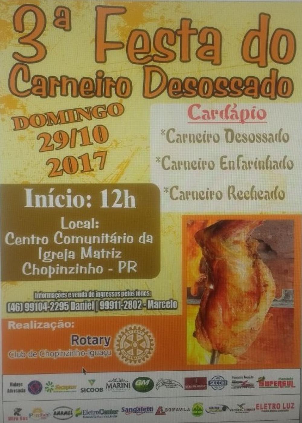O Rotary Clube de Chopinzinho-Iguaçu, realiza no próximo domingo, dia 29 de outubro, a 3ª Festa do Carneiro Desossado. O evento está programado para acontecer no Centro Comunitário São Francisco de Assis.