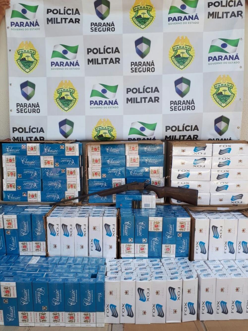 Em Coronel Vivida a polícia efetuou a apreensão de 01 espingarda Cal. 36, Marca CBC, e 05 cartuchos, além de produtos de roubo em Chopinzinho e 06 mil maços de cigarros oriundos do Paraguai.
