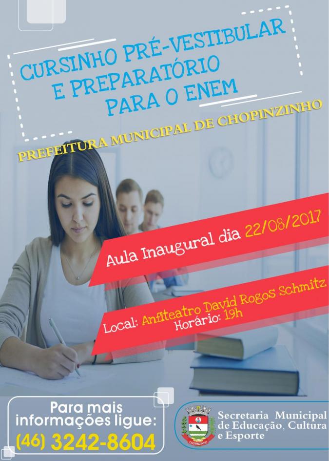 Na próxima terça-feira (22), às 19h, no Anfiteatro David Rogos Schimtz, acontece a Aula inaugural do Cursinho preparatório para Enem e Vestibular da Prefeitura de Chopinzinho. Neste primeiro encontro, haverá presença de autoridades, apresentação dos professores e entrega do material. Em 2017, foram mais de 120 inscritos, que vão participar gratuitamente dos três meses de curso.