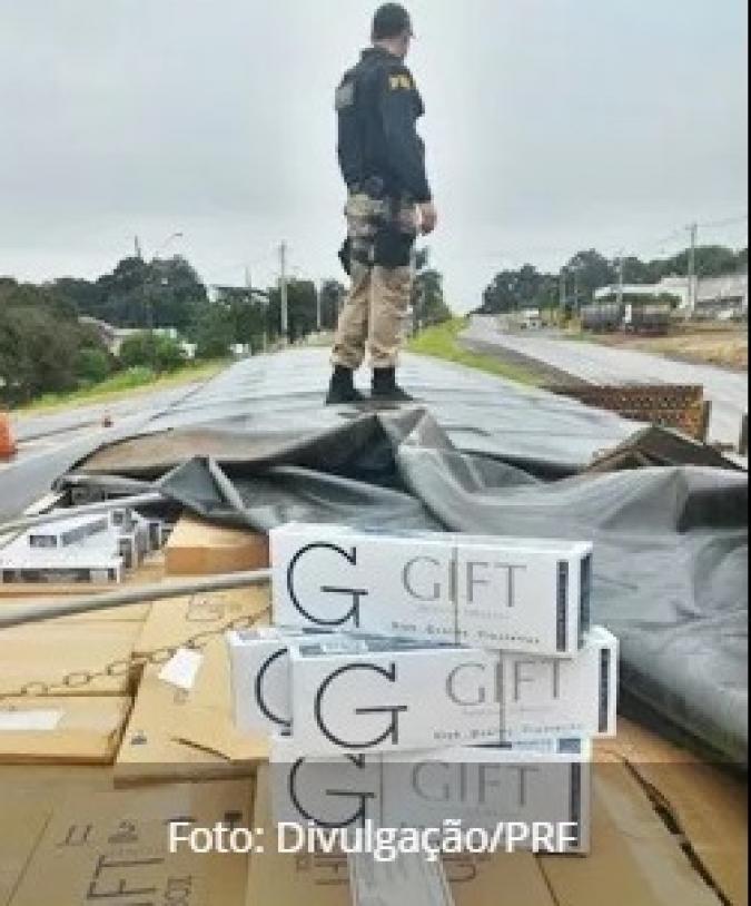 O semirreboque acoplado ao caminhão estava totalmente lotado de caixas de cigarro. O crime de contrabando tem pena prevista de dois a cinco anos de prisão.