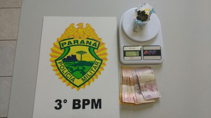 Durante busca pessoal, os policiais encontraram no bolso direito da blusa de moletom do indivíduo, dois invólucros contendo maconha. No bolso da calça jeans foram localizadas seis cédulas de dinheiro, totalizando sessenta reais.