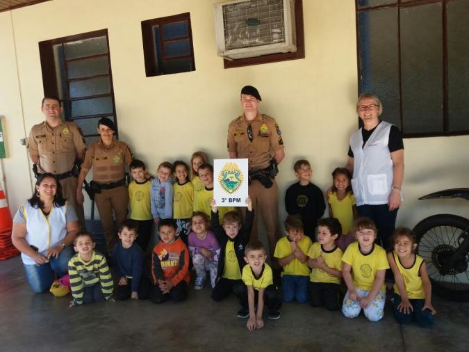 Os alunos do jardim II da Escola Municipal Tasso Azevedo da Silveira com as professoras Ivana e Juliane, tomaram café da manhã com os policiais e depois receberam orientações sobre o serviço policial, fardamento, armamento e praticaram atividades físicas.