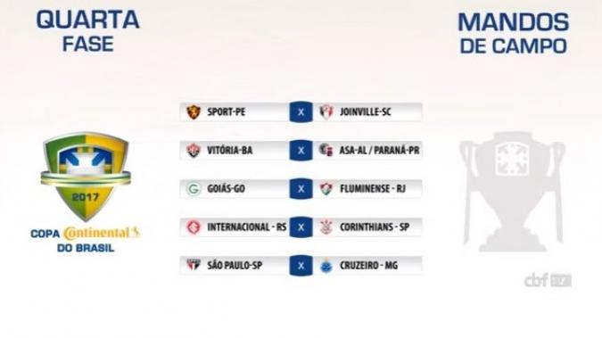 Em sorteio realizado nesta sexta-feira, foram definidos os confrontos da quarta fase da Copa do Brasil. O grande destaque foi a definição de dois clássicos brasileiros já neste estágio da competição: Corinthians contra Internacional e Cruzeiro contra São Paulo. As partidas de ida devem acontecer nos próximos dias 5 ou 12 de abril, enquanto os de volta podem ser realizadas nos dias 12 ou 19 do mesmo mês.