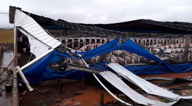 As fortes chuvas e ventos registradas na tarde deste domingo na região sudoeste, causou estragos em vários municípios. Em Chopinzinho, a Defesa Civil registrou o destelhamento parcial de uma residência no Bairro Frei Vito, e danos em Algumas propriedades na região da Invernadinha. Os maiores estragos foram registrados na propriedade de César Derlan, onde o vento arrancou praticamente toda a cobertura de um barracão de criação de suínos.