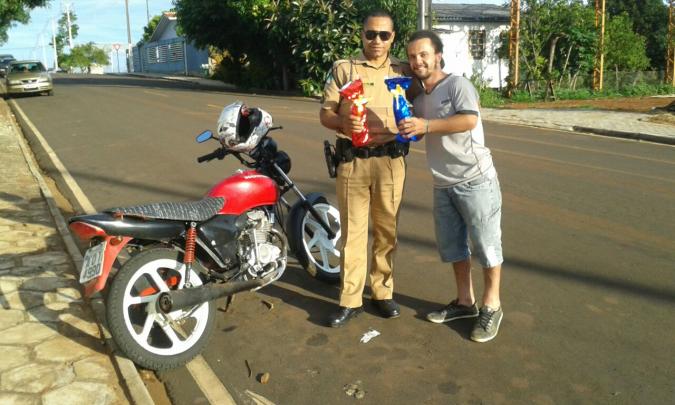Na última terça feira, dia 13, o proprietário de uma moto roubada em Saudade do Iguaçu na semana passada e recuperada menos de 12 horas depois em São João do Ivai, no norte do estado, esteve no Destacamento da Polícia Militar da cidade para agradecer pessoalmente aos policiais Leporacy e Maurício pela eficiência e agilidade na investigação e recuperação da moto com a apreensão de dois menores que foram os autores do roubo.