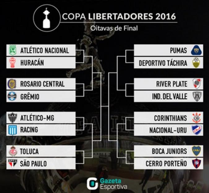 O Corinthians, que terminou na liderança do Grupo 8, enfrentará os uruguaios do Nacional. O time de Montevidéu também criou diversos problemas para o Palmeiras na fase de grupos. Já o Atlético-MG, primeiro colocado do Grupo 5, terá um duelo difícil contra os argentinos do Racing.