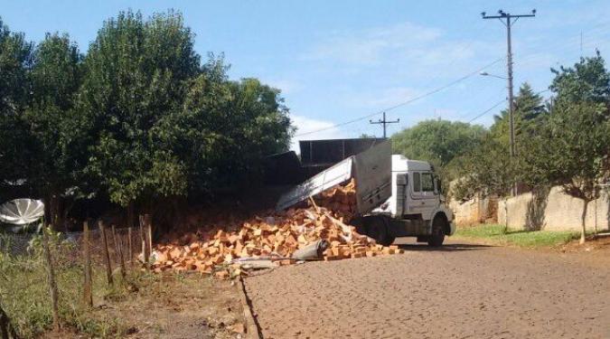 Quando a PM chegou ao local verificou que um caminhão trator Scania 113H com placas MKT-2256, havia tombado a carga de aproximadamente 7.000 tijolos em cima de um veículo gol de placas ALI-9675, este que estava estacionado em frente à residência do proprietário.
