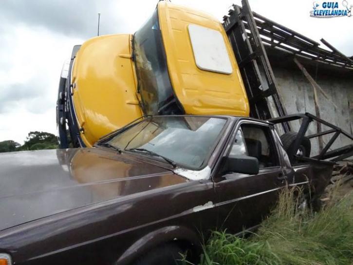 O acidente ocorreu na tarde desta segunda-feira (02), próximo ao trevo de Clevelândia sentido a Mariópolis, envolvendo um caminhão Mercedes-Benz, placas de Marmeleiro conduzido por Aldemir Antunes da Silva e uma Saveiro placas de Clevelândia conduzida por Dimorvam Faoro. O caminhão tombou em cima da camionete.