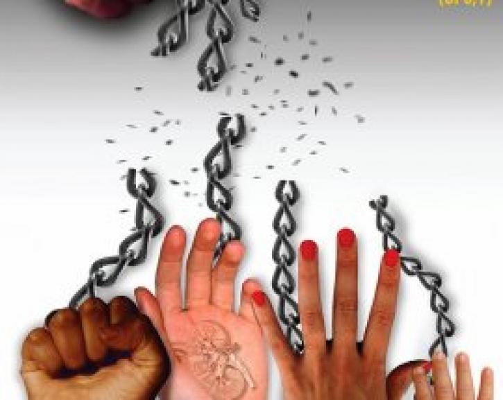 2-Essa situação rompe com o projeto de vida na liberdade e na paz e viola a dignidade e os direitos do ser humano, criado à imagem e semelhança de Deus. A sombra, na parte superior do cartaz, expressa as violações do tráfico humano, que ferem a fraternidade e a solidariedade, que empobrecem e desumanizam a sociedade.