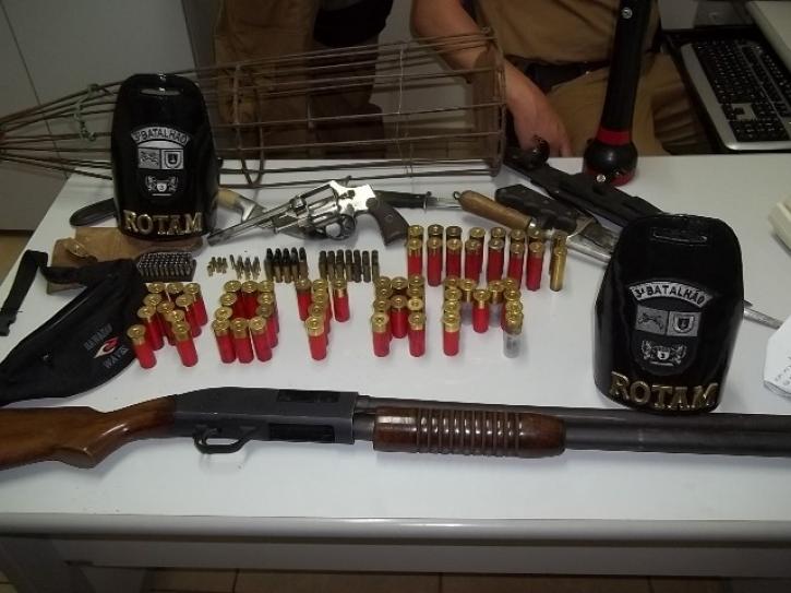 Policiais da ROTAM da 2°Cia de Palmas, sul do Paraná apreenderam na noite de quinta-feira, 22, no interior do município de Clevelândia, arma, munições e carne de caças e prenderam três pessoas envolvidas com a caça ilegal. O fato foi registrado após os policiais receberem várias denúncias anônimas informando que na Fazenda Gauchinha estava ocorrendo disparos de armas de fogo.