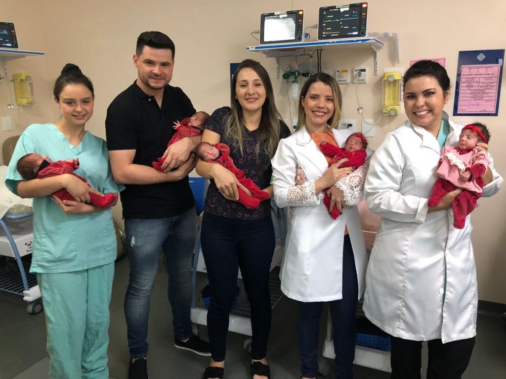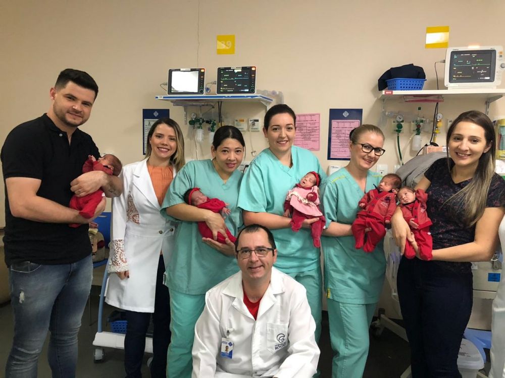 Nesta sexta feira, dia 25, pela primeira vez foram feitas fotos dos cinco bebês com os pais Anieli e Luis Fernando e também com a equipe médica que faz o acompanhamento.