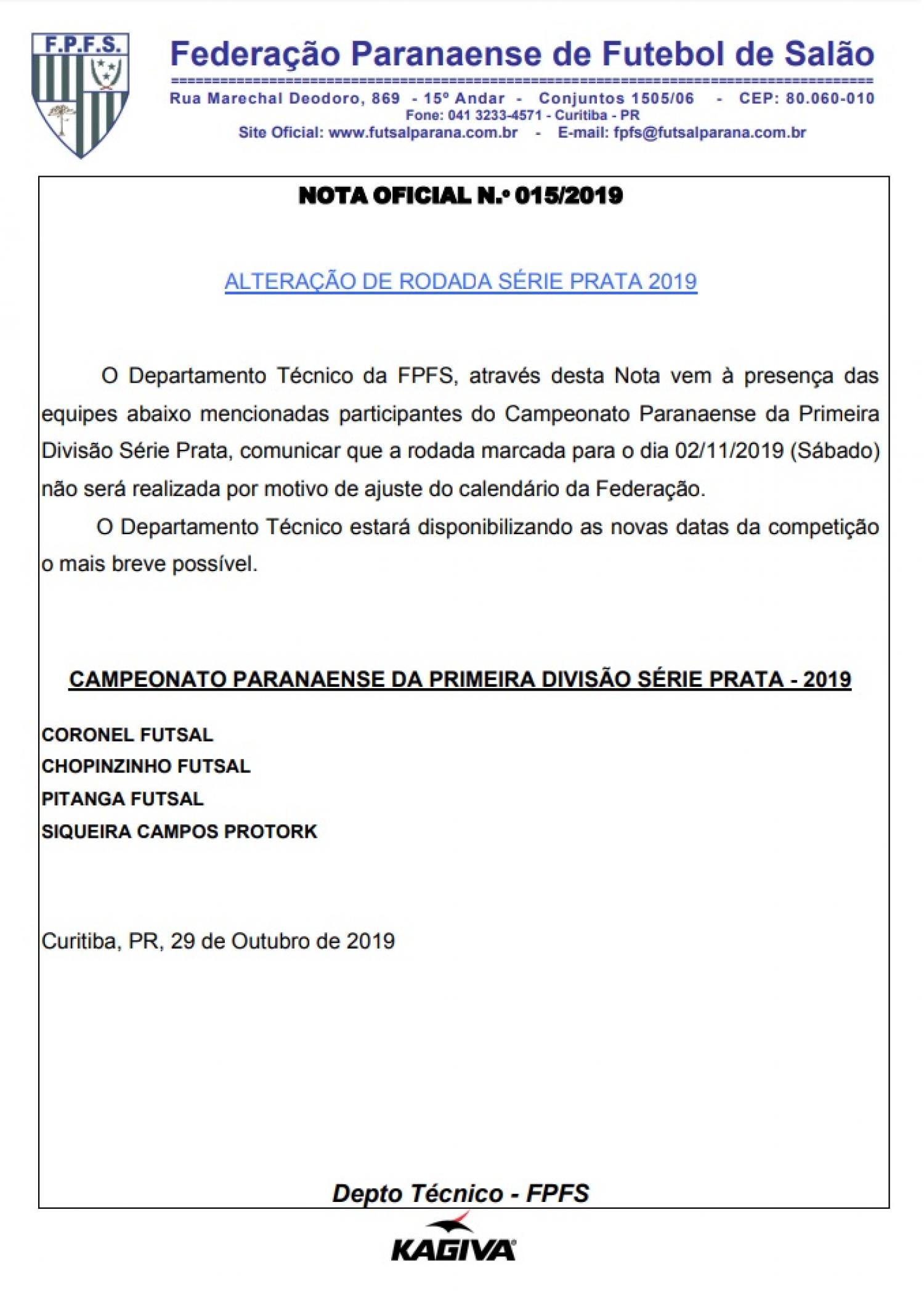 Na tarde desta terça feira, dia 29, a Federação Paranaense Futsal-FPFS, emitiu nota oficial através do seu Departamento Técnico, cancelando a rodada com os jogos das semifinais da série prata entre Coronel Futsal X ACEL-Chopinzinho e Pitanga Futsal X Siqueira Campos, que estava marcado para o próximo sábado, dia 02.