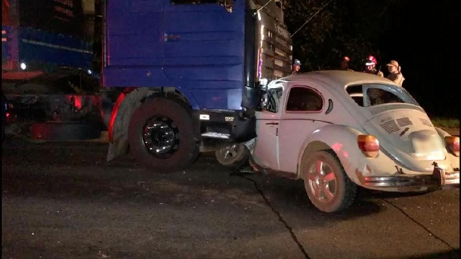 O acidente por volta das 21h30 e envolveu um veículo Fusca com placas de Nova Esperança do Sudoeste e um caminhão Scania do Paraguai.