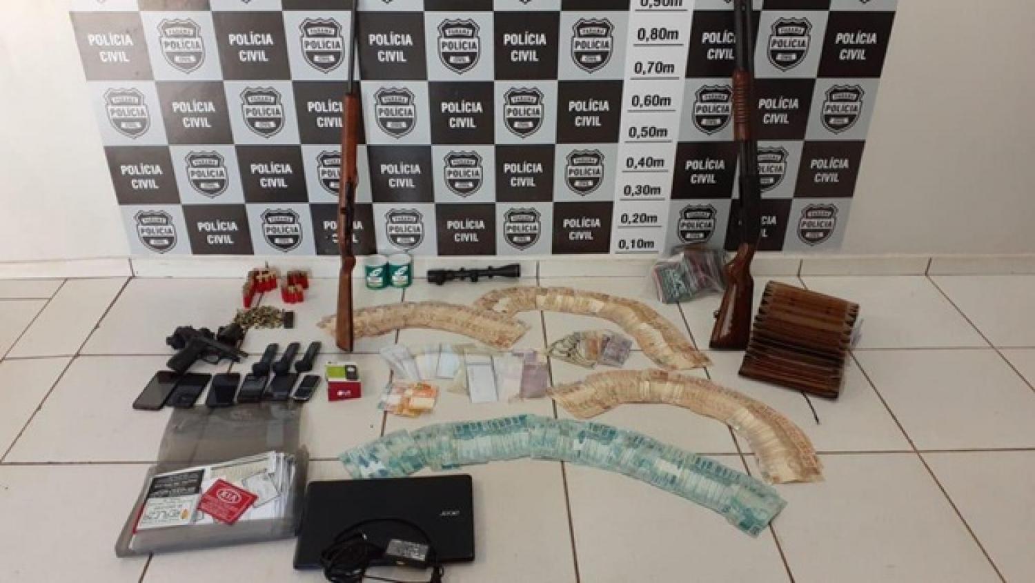 Também foram apreendidos na operação 05 armas de fogo, 813 munições, R$ 22.854,00 em dinheiro, 47 cheques de valores diversos e 06 telefones celulares. Uma pessoa foi presa por posse ilegal de arma de fogo.