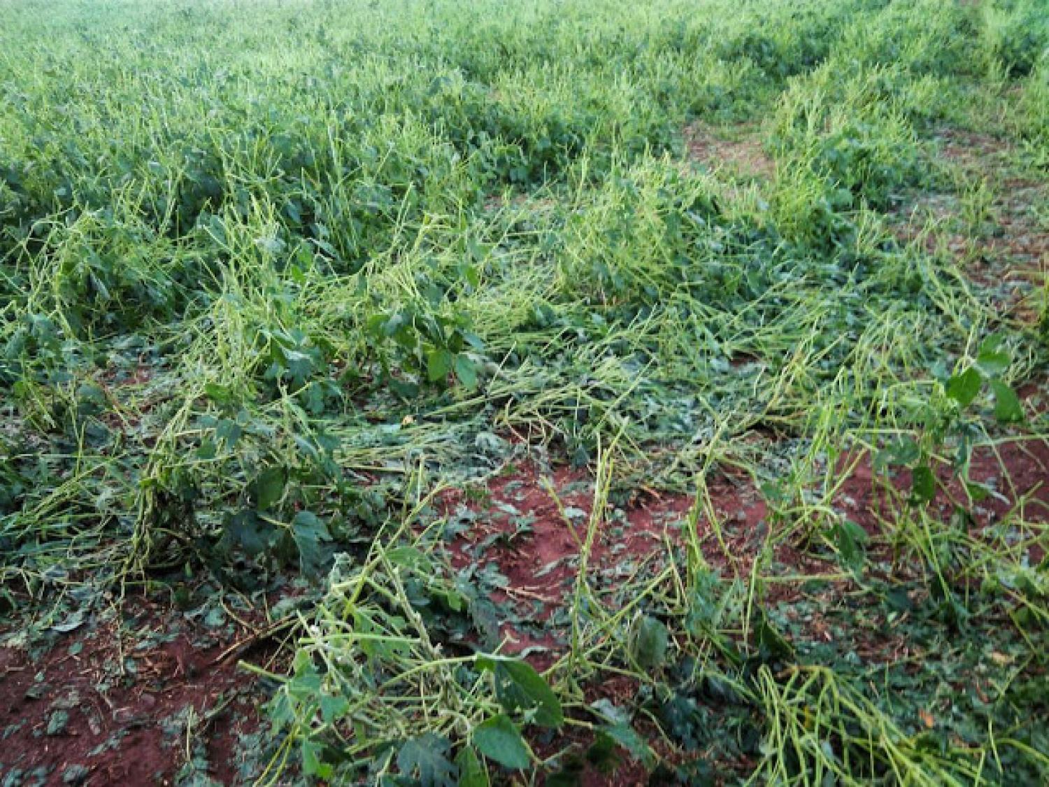 Como a soja, ali naquela região, foi plantada próximo o dia 10 de outubro, devido à falta de chuvas (normalmente o plantio acontece no dia 20 de setembro), praticamente todas as plantas ainda estavam na fase de enchimento de grãos. "A região recebeu mais de 50 mm no domingo e depois veio o granizo. Eu estava voltando pra fazenda a noite quando percebi o tamanho do estrago”, afirma o produtor Vinicius Amaral Costa.