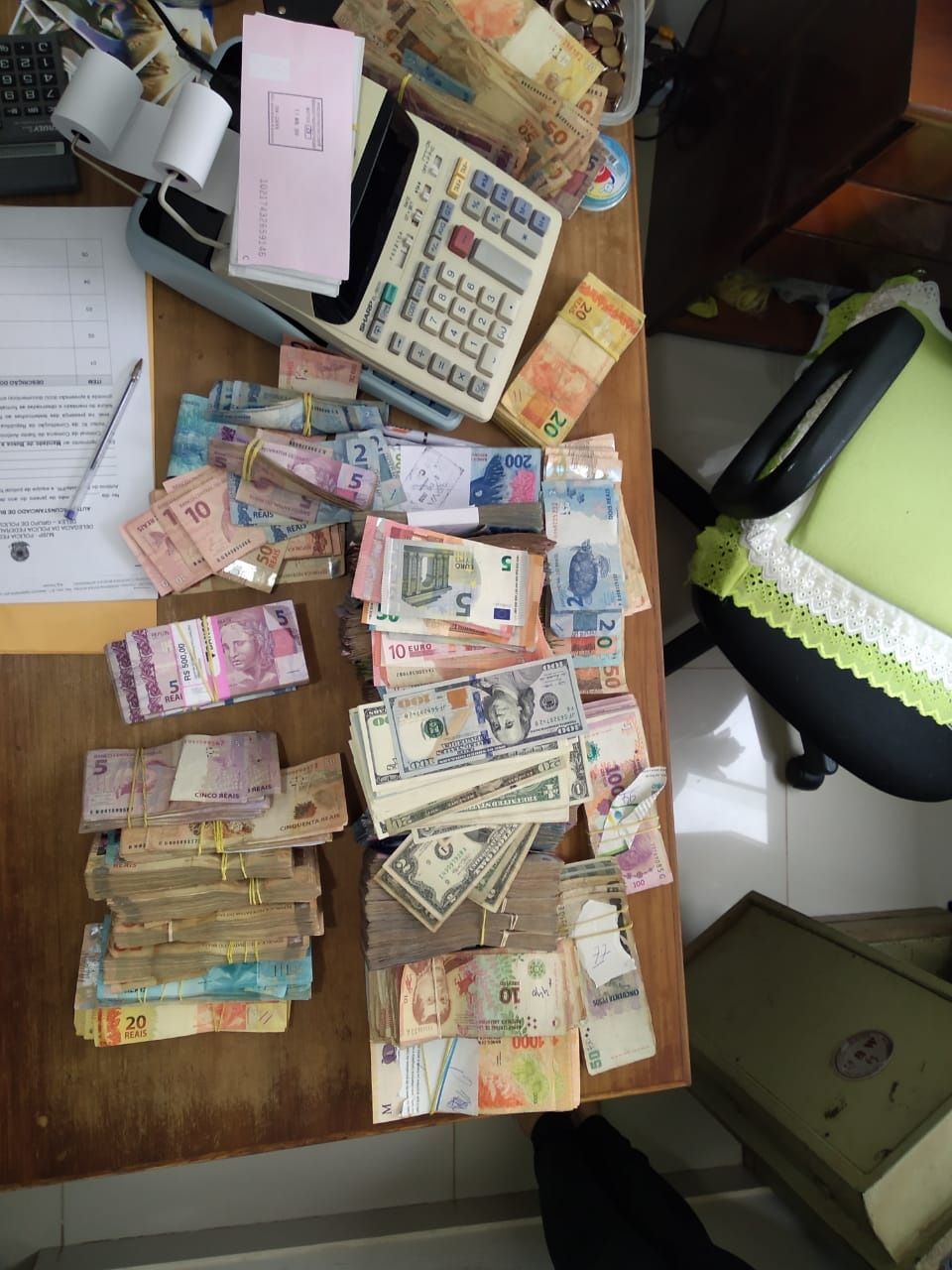 Foram cumpridos 2 Mandados de Busca e Apreensão em residências de empresários daquele município que resultaram na apreensão de 2 máquinas de contar cédulas, 63 cheques bancários com valor total de 89.392,00, 495,00 Euros, 12.011,00 dólares e 1.046.795,00 Pesos Argentinos e 46.700 reais em espécie.