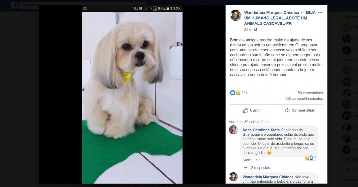 Porém, a PRF disse que poderia ter um cão de porte pequeno em um dos veículos, mas não havia informação se o animal teria sido localizado. Nessa sexta (24), uma amiga da família fez um post no Facebook pedindo ajuda para encontrar cãozinho BERNARDO o ''BEBÊ....''
