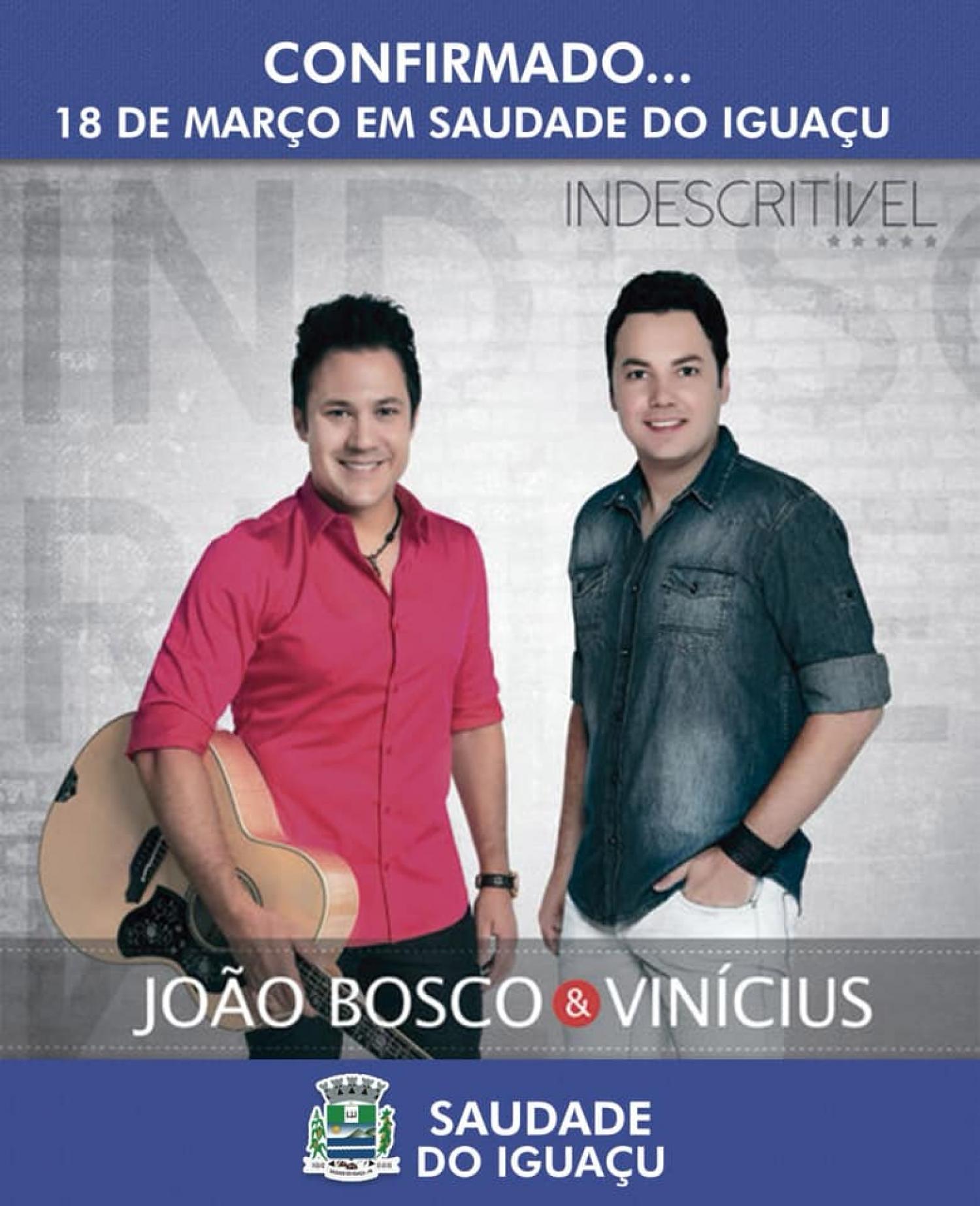 De acordo com o Prefeito Mauro Cenci, o Show acontecerá na quarta feira 18 de março, véspera de feriado municipal. “Neste ano optamos por fazer nossas festividades em dois dias, 18 e 19 de março, sendo que no dia 19 temos nosso feriado municipal de aniversário de emancipação política. O Show com a dupla “João Bosco e Vinícius”, que é a principal atração acontece na quarta feira 18 de março, véspera de feriado municipal e terá entrada franca. Conhecemos a qualidade da dupla em questão e sabemos que deverá agradar a grande maioria dos Saudadenses e dos munícipes vizinhos que nos visitarem na ocasião. ” Disse o Prefeito.
