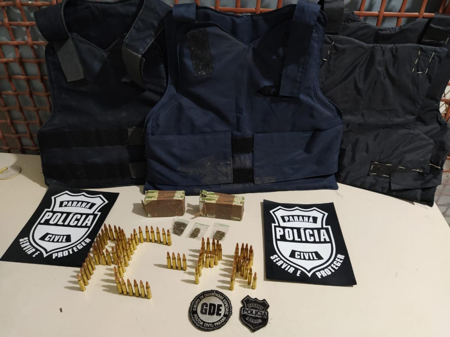 Na sequência, as equipes se dirigiram até o endereço e localizaram 03 (três) coletes balísticos, um deles que foi roubado do segurança da referida instituição bancária, 77 (setenta e sete) munições de fuzil, calibre .223, R$ 511,00 (quinhentos e onze reais), e 03 (três) pequenas porções de maconha, razão pela qual prenderam em flagrante o casal posse de munição de uso restrito, organização criminosa e posse de drogas para consumo pessoal.