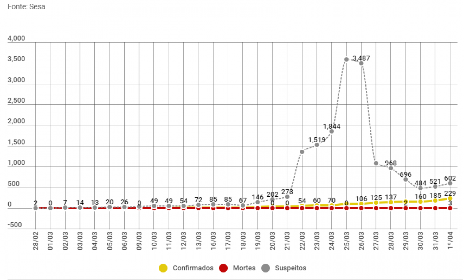 Ontem, o Ministério da Saúde informou ontem que os óbitos chegaram a 240 em todo o país. Além disso, apenas sete estados ainda não tiveram mortes pela Covid-19: Espírito Santo, Mato Grosso, Sergipe, Tocantins, Roraima, Amapá e Acre.