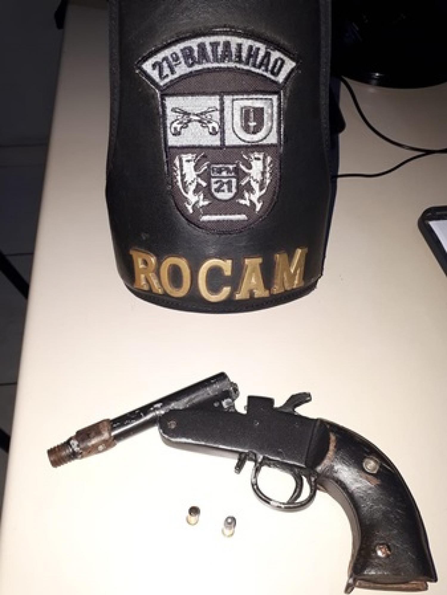 O veículo foi abordado e identificado os ocupantes. No bolso da calça do condutor foi encontrado um cartucho calibre 22 e embaixo do banco do motorista foi localizada uma Garrucha calibre 22 com um cartucho deflagrado.