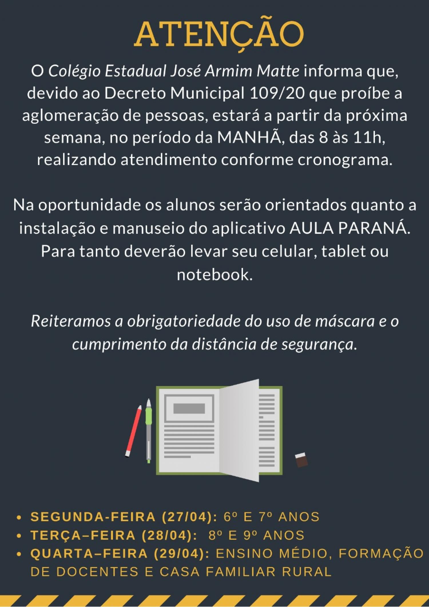 A partir desta semana o Colégio Estadual José Armim Matte (JAM) de Chopinzinho, estará com uma equipe no estabelecimento para auxiliar os alunos que estão com dificuldades na instalação e manuseio do aplicativo “Aula Paraná” em seus celulares, tablet ou notebook.