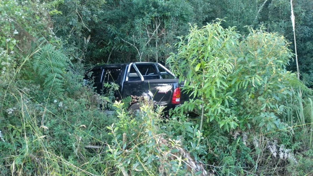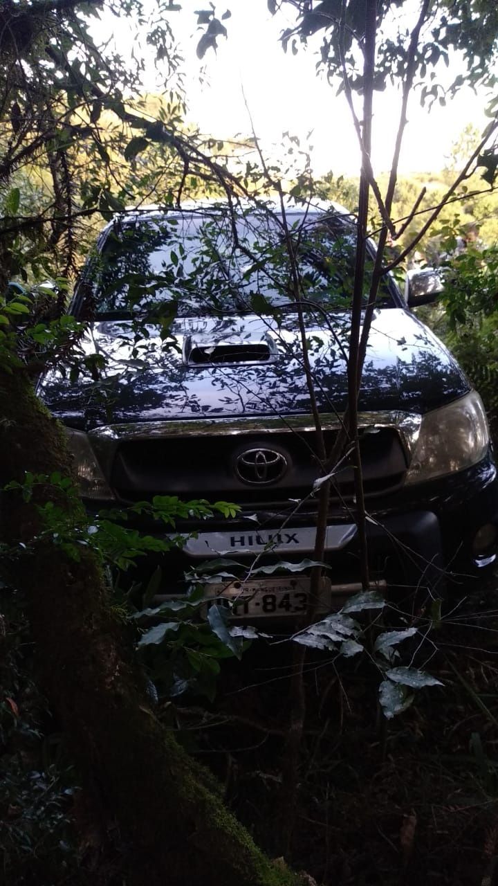 Na tarde desta sexta-feira, dia 29, após denúncia anônima, chegou a conhecimento da equipe policial de que a caminhonete Toyota Hilux, placas HMT-8431, cor preta, que havia sido roubada no Distrito do Covó, em Mangueirinha na manhã de quinta-feira, dia 28, havia sido localizada escondida em uma mata, nas proximidades da comunidade de onde ela foi levada.