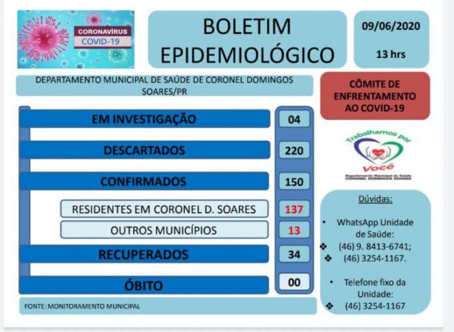 Segundo o boletim epidemiológico divulgado na tarde desta terça-feira (09), sobe para 150 os casos de pacientes infectados pela Covid-19 no município de Coronel Domingo Soares.