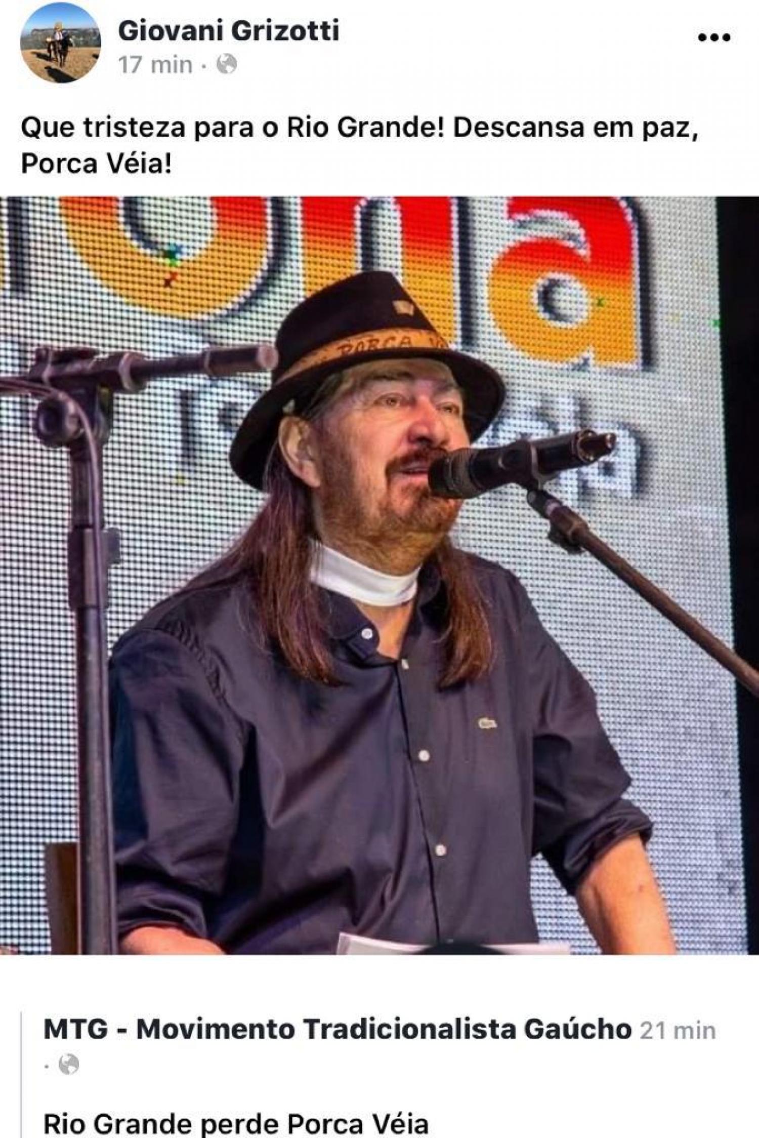 É com muita tristeza que noticiamos o falecimento do gaiteiro, cantor e compositor Porca Veia. Ele morreu há pouco, aos 68 anos, no Hospital Regina, em Novo Hamburgo, vítima de um parada cardíaca.