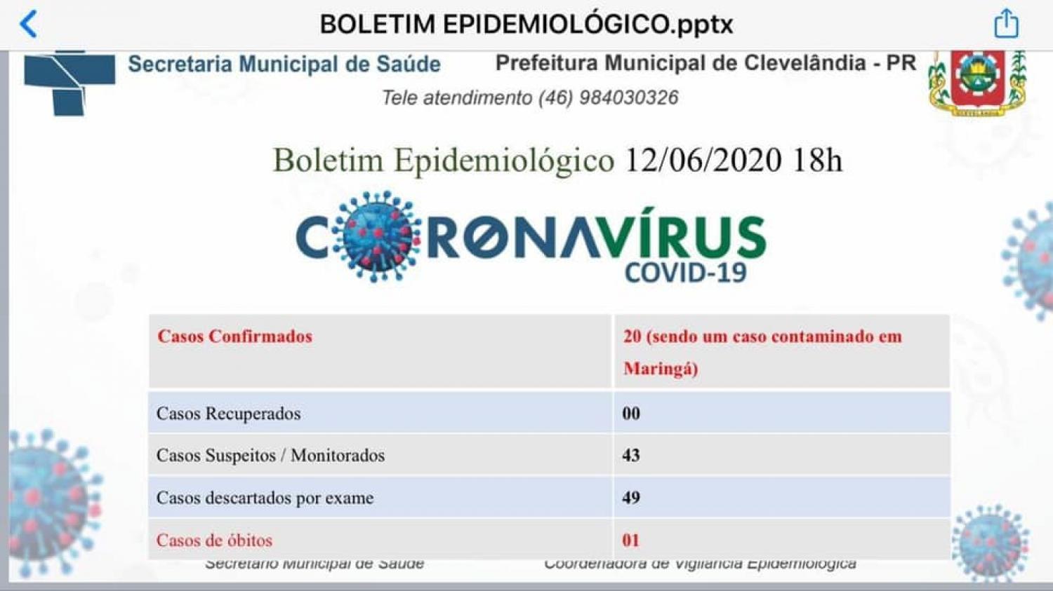 O município de Clevelândia confirmou a primeira morte por Coronavirus. O paciente estava internado na UTI (Unidade de Terapia Intensiva) do Hospital São Lucas, em Pato Branco, não resistindo, entrando em óbito ainda na quinta-feira (11). O anúncio oficial foi realizado nesta sexta-feira, após a divulgação de resultado de exames pelo Laboratório Central, que confirmou que o paciente havia sido infectado.
