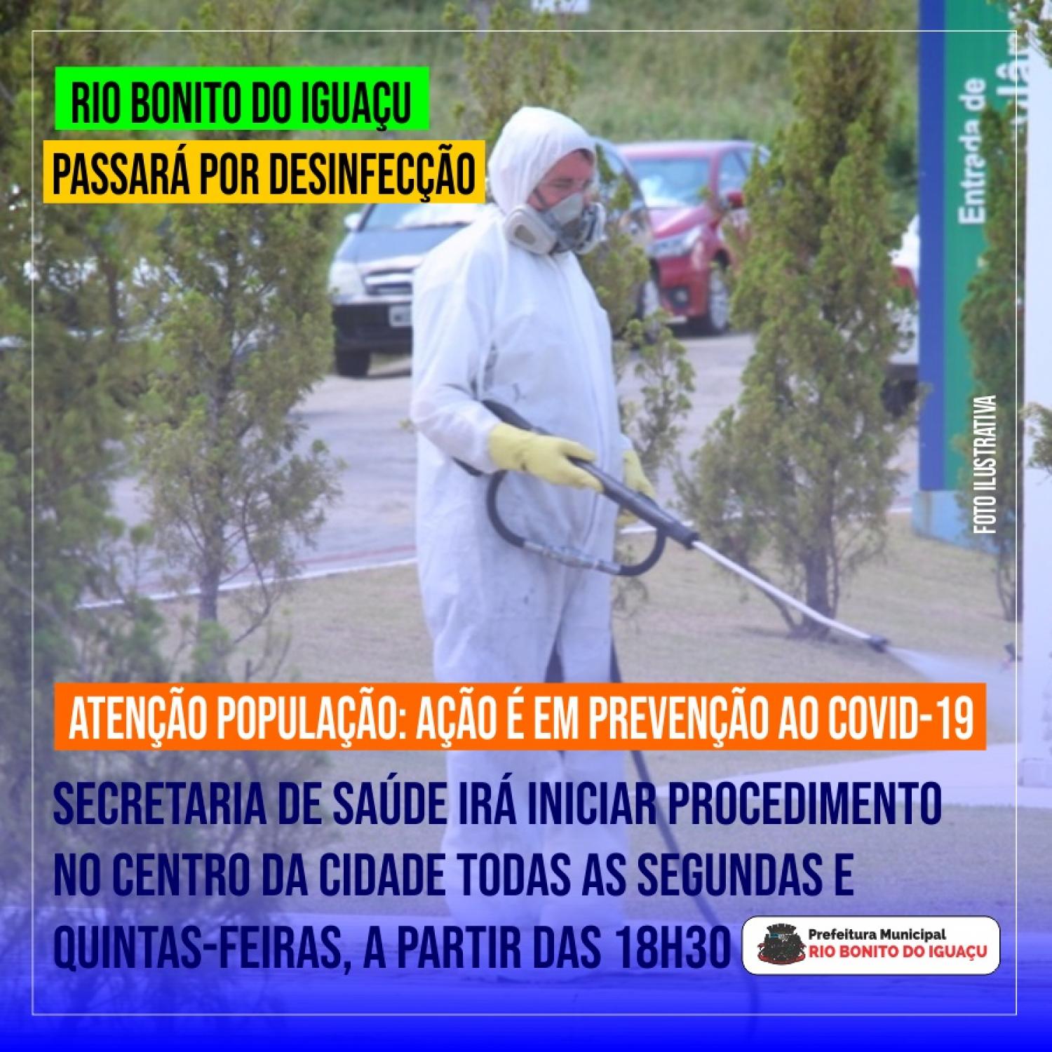 Atenção população de Rio Bonito do Iguaçu: Devido ao aumento de casos de coronavírus em nosso município, a Secretaria de Saúde vai iniciar a desinfecção das principais ruas e pontos de aglomeração da cidade. Todas as segundas e quintas-feiras, a partir as 18h30 (seis e trinta da tarde), será feita a pulverização. É importante que neste horário a população evite sair às ruas para não ter contato com o produto aplicado.