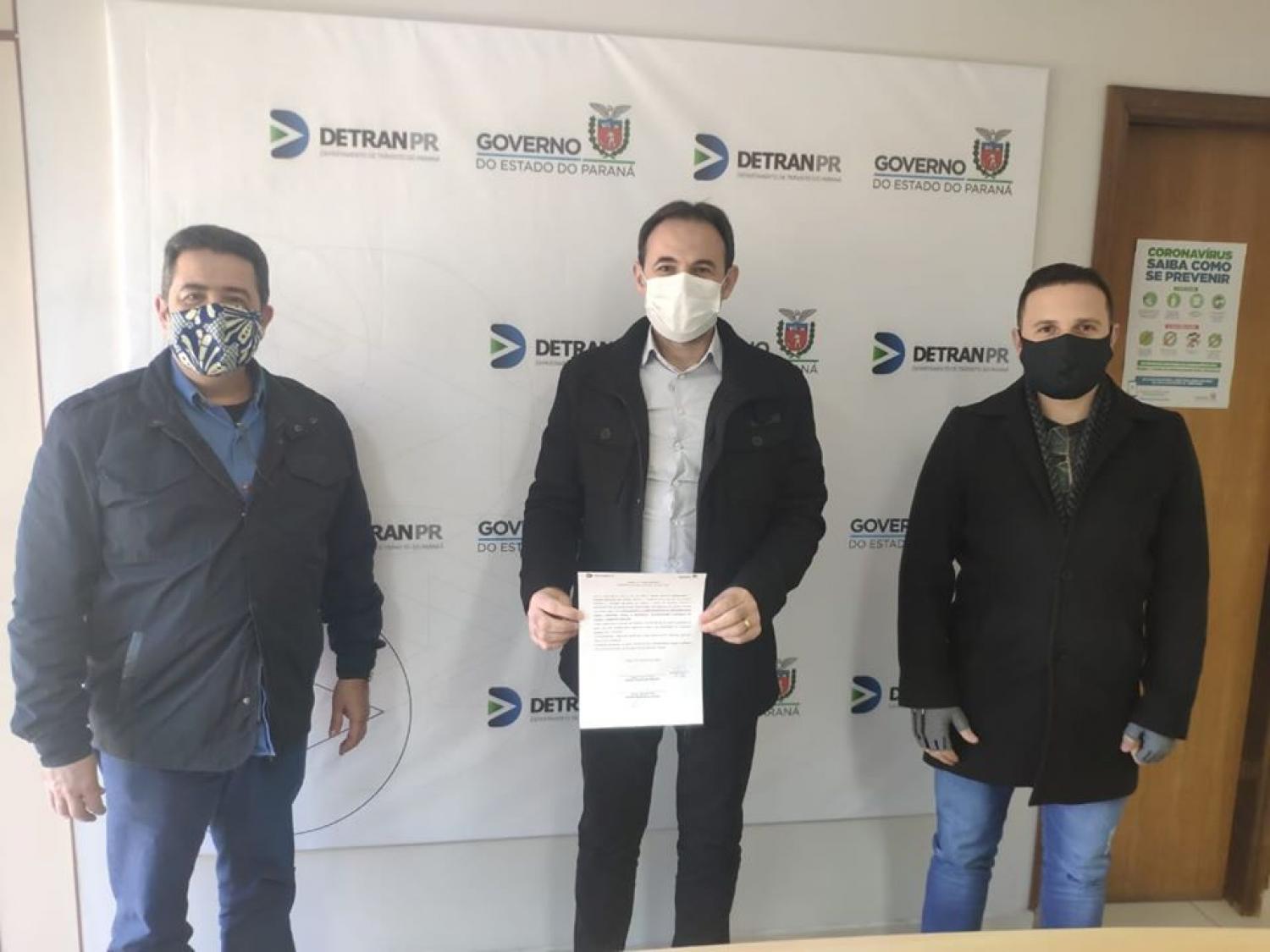 O prefeito Gelson Costa e o vice-prefeito Christian Picolo estiveram reunidos com o chefe de gabinete do Detran-PR, Coronel Éveron César Puchetti, na sexta-feira (3), em Curitiba, para assinatura do convênio de sinalização viária 2020.